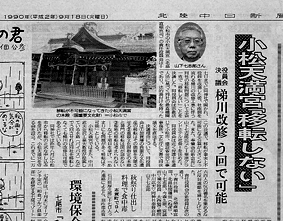 | まず、私が一人で金沢の建設省金沢工事事務所へ出向き、副所長と会談。会談で正式に梯川拡福工事で天満宮移転ありきではないとの回答を得た。これを受けて、建設省、天満宮の2者による非公式会談を開くことを合意した。 出席者はそれぞれ2人づつとし、日時、場所はそのつど決定する。後に小松市の担当者も同席させてほしいとの意向を了承して、合計5人の出席による非公式会談がスタートした。守る会からは、私と河川の専門家の中川武夫先生が出席することとなる。 この間に、市役所の動きが活発になり、次のような情報が飛び込んできた。天満宮のような宗教法人は、財産などの管理、運営は責任役員に任されている。小松天満宮ではこの時5人の責任役員が登記されていた。その内の2人は賛成派とみられ、あと1人賛成に口説けば、責任役員会で移転賛成が決議される可能性がでてきた。責任役員の内宮司、禰宣は当事者で勿論反対意見だから、あと1人の取込みを画策しているというのであった。 市側は、会談前に責任役員会を開催させて、無理矢理賛成決議に持ち込み、会談そのものの意味を無くそうとの陰謀であったようだが、この情報を察知して、いち早く対処した守る会の行動の早さに面喰らった様子であった。