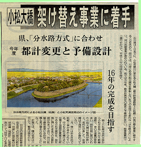 当初の私の案では、バイパス部分を暗渠にするものであったが、この部分がオープンになって、水路として拡幅されることになった。暗渠にすることは、ここに生活する天満宮の人々を配慮してのことで、当事者がそのことを納得するならば、問題は発生しない事であった。これによって、梯川改修による小松天満宮移転問題は完全解決したのである。工事完成までまだ少しの年月がかかるが、文化財をこのように守った前例は世界で初めてのケースで、小松市が世界に誇れる河川工事の前例となる。私と行動を共にして戦ってこられた中川武夫教授のこの論文が、河川工学の世界学会紙に平成8年掲載されたことを付け加えておく。