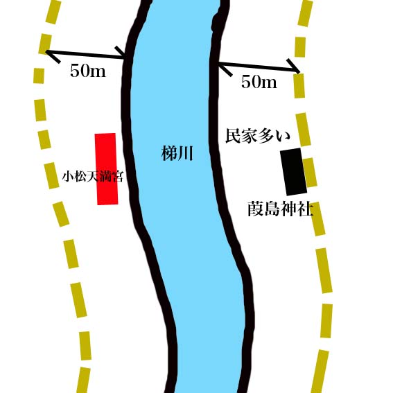 ここまでの決定は、小松天満宮にとってなんら問題ではなかったが、梯川の側にある同宮がこともあろうにこの拡幅工事の法線の中に入れられたことから問題化する。では、なぜそのように決定されたのかを見てみよう。 |