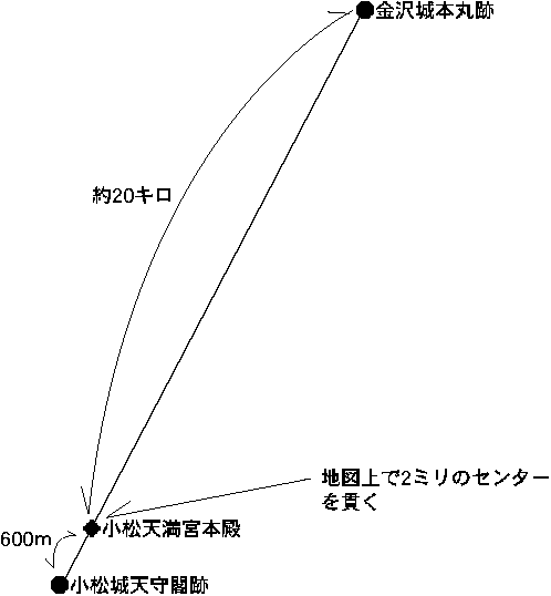お互いに沈黙の4年間という時間が過ぎ去っていった。昭和61年のことであった。撮影取材のために、私の手元には北陸の五万分の一の地図が全て揃っていた。ある日の真夜中、ある閃きで目がさめた。まるで神の声が聞こえたようであった。地図を繋げ! 作業場の二階へ飛び込んで五万分の一の地図を6枚切り抜いて繋いだ。そして、金尺で小松城、金沢城の本丸あたりを結んでみた。すると、正確に小松天満宮の社の小さな四角の中心にその線がくる。何ということだろうか。これは偶然ではない。何か意図するものがあるに違いない。そう直感した。 |