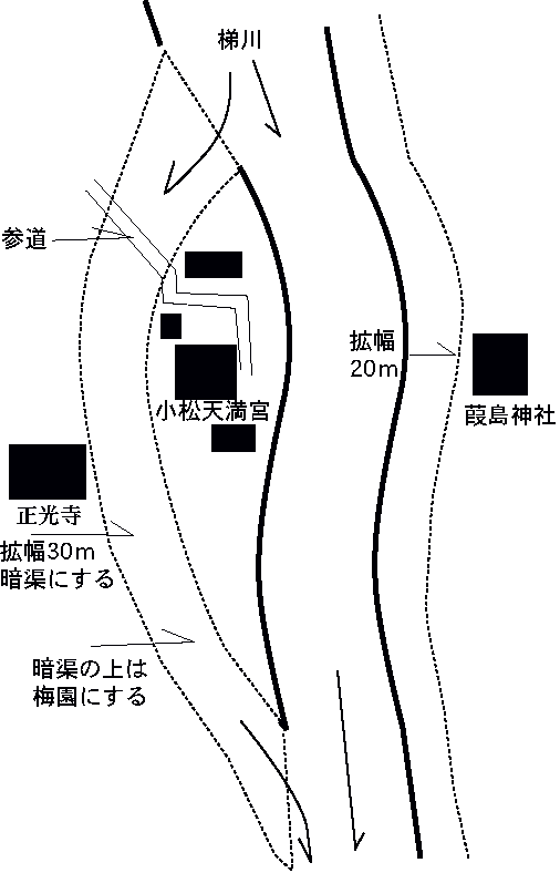 このように、次第に小松天満宮が現在位置から移転できない理由が判明する中、ある真夜中私は再び閃きによって起こされる。それは、梯川の拡幅方法に関するもので、天満宮の右にバイパスを作り、左岸を葭島神社ぎりぎりにまで広げることによって、解決できないかという方法であった。 |