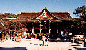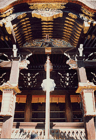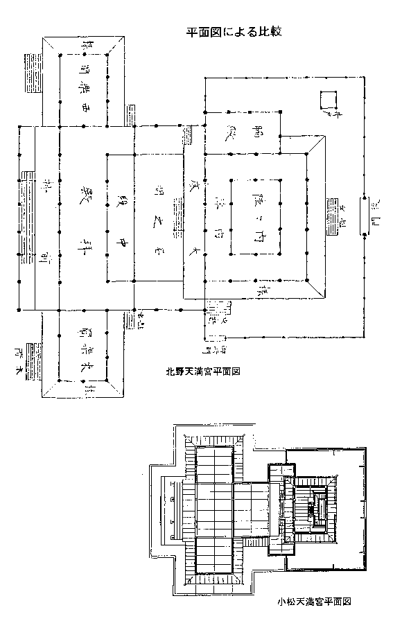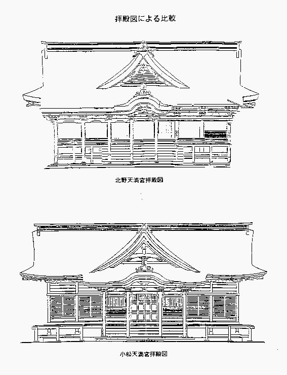 | 文献によれば、小松天満宮は北野天満宮の御神体を遷座したと伝えられ、社殿も北野天満宮の4分の1に縮尺して造営されたと伝えられていた。しかし、実際どのサイズが縮尺されたのか不明であった。普通に考えて、体積を縮尺すると、天井が低くなって実用にはならない。いったいどの寸法を縮尺したのであろうか。 この問題を解決すべく、京都の北野天満宮へ調査に向かうことになった。そして、あらゆる部分の形式、様式がそっくりにできていることにまず驚かされた。下記の写真はその時撮影されたもの一部で、両者を比較すれば一目瞭然だ。 |