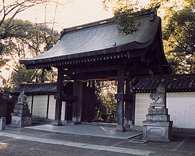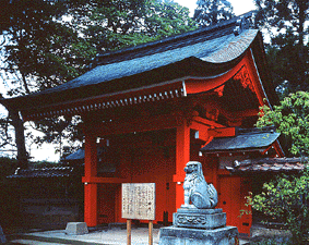| この時の調査は、建物の形式の調査と、建物の方角の調査であった。方角の話は後に述べるとして、本殿、拝殿の調査を終えて、裏に回ってあっと声を上げそうになった。そこには、小松天満宮の通称赤門と呼ばれる神門とそっくりな門があった。 北野天満宮の北門であった。 |